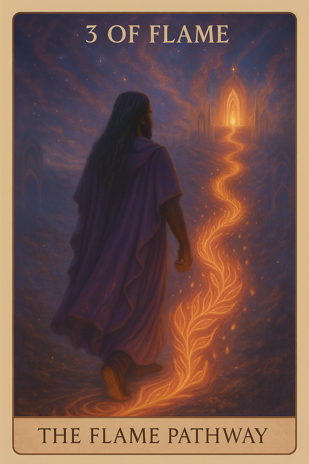 The 3 of Flame is a sign that your flame has found its rhythm. What was once internal—the Spark, the mirror—is now being felt and seen in the outer world. You are in motion, and the flame path is opening before you. There is alignment, forward movement, and a growing sense of purpose. This card often arises when your inner work begins to crystallize into form: a creative project, a new role, an offering, or a vision made tangible.