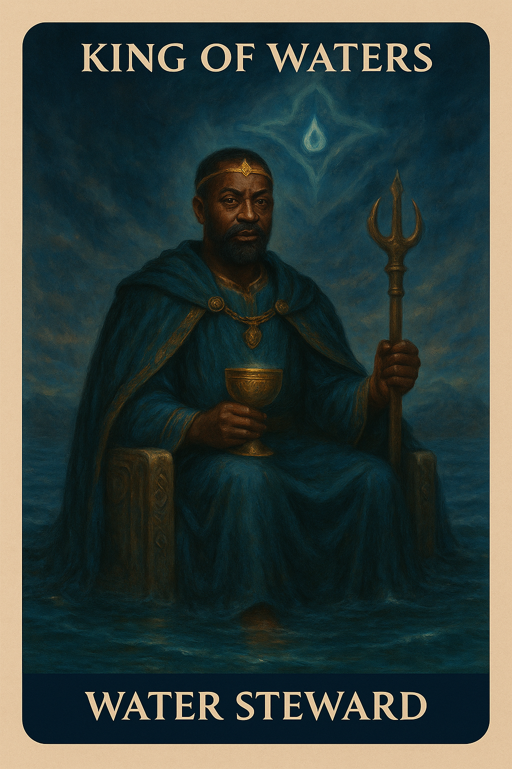 The King of Waters is the mature flame of the emotional realm—a guide, a steward, a quiet force of depth and grace. He has faced grief and joy, longing and loss, and has not turned away. Instead, he has learned how to hold it all—and to lead from that stillness.