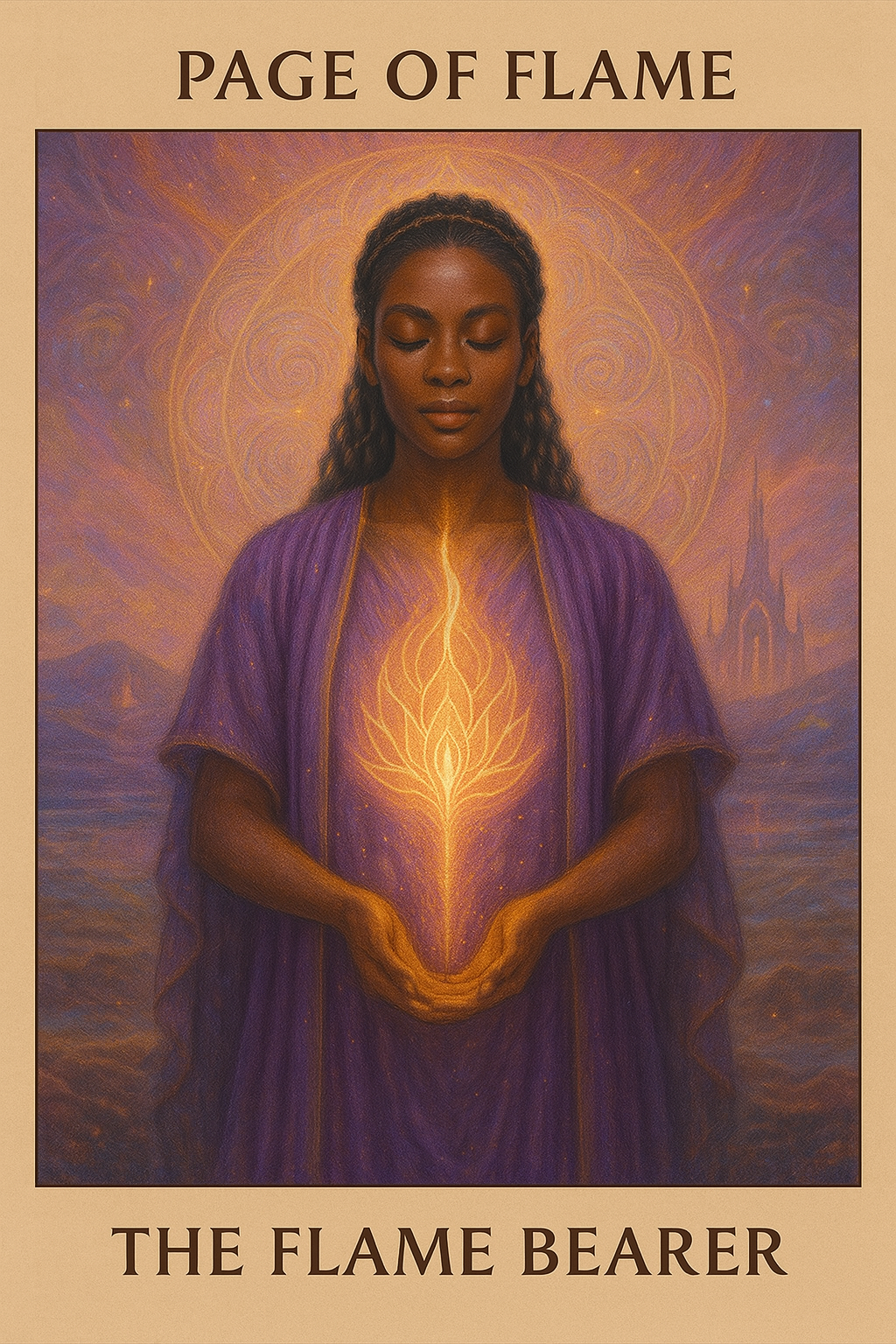 The Page of Flame is the child of the fire—the one who carries the flame with innocence, wonder, and openness. This card speaks of a new soul cycle, one where you are beginning again—not from lack, but from remembrance. You may be learning how to walk with your gifts in a fresh way, feeling inspired by a new path, or reconnecting with your creative essence after a long silence.