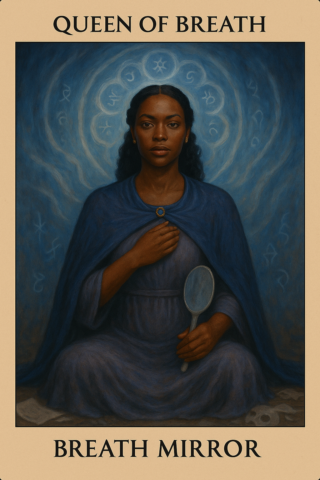 The Queen of Breath doesn’t just speak truth—she embodies it. Her presence alone communicates clarity. She’s moved beyond performance and now trusts her resonance more than her words. When this card appears, it reflects a phase of powerful inner knowing—where your truth no longer needs to be defended, only held.